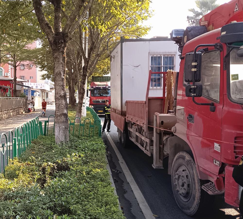本报讯 近日,厦门市交通执法支队同安大队在辖区巡查时,发现并紧急处置一起典型的货车超限运输违法案件,依法查扣一辆违规运载超宽活动板房的货车,现场消除了道路安全隐患,并对涉事运输企业作出行政处罚。