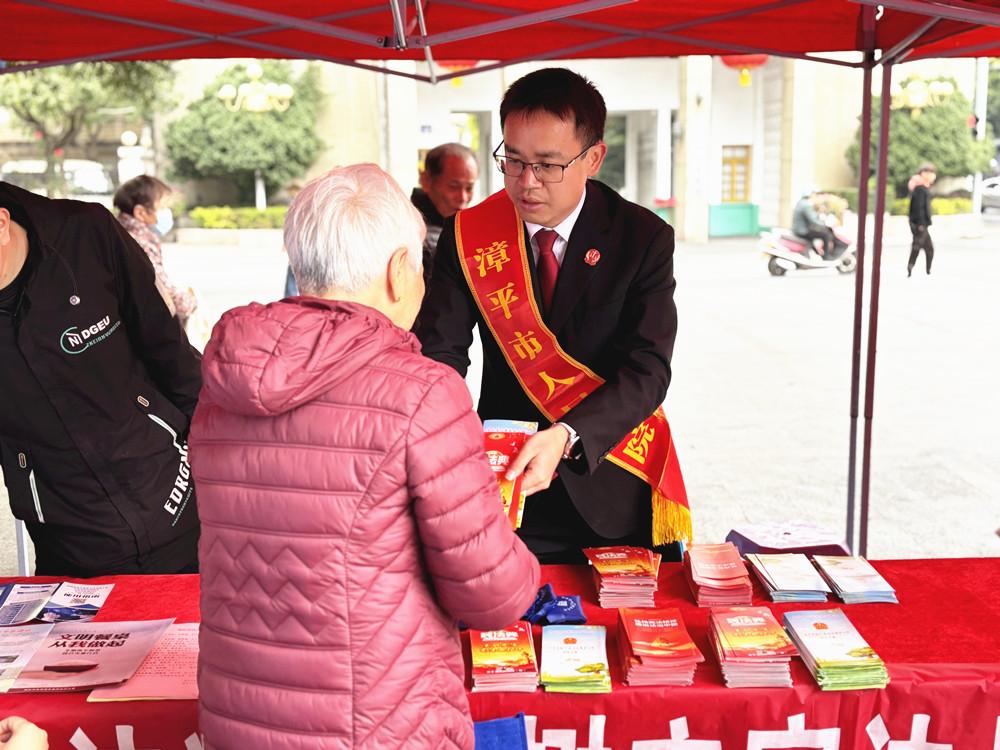 近日,漳平法院围绕非法集资诈骗、老年人权益保护等内容,组织干警到漳平市政府门前广场开展普法宣传活动。图为干警向群众分发法律知识手册。 |