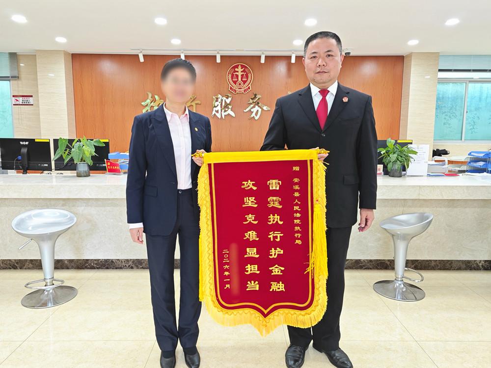 近日,安溪某银行股份有限公司负责人向安溪县人民法院执行局送上一面印有“雷霆执行护金融 攻坚克难显担当”字样的锦旗,对安溪法院高效执行,化解金融风险表示感谢。 |
