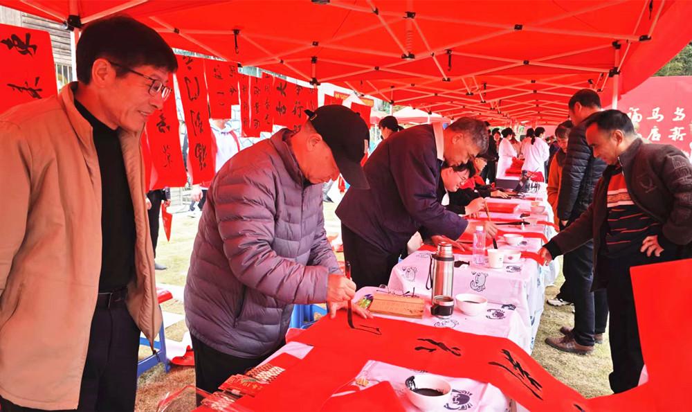 近日,由三明市委宣传部联合多部门主办的三明市文化科技卫生“三下乡”集中服务活动在沙县南阳举行。图为书法志愿者为群众现场手写春联。 |
