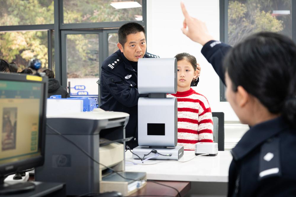 近日,三明市公安局洋溪派出所使用AI拍照设备,为辖区50多名适龄学生集中办理身份证业务。图为民警指导孩子完成身份证图像拍摄。 |