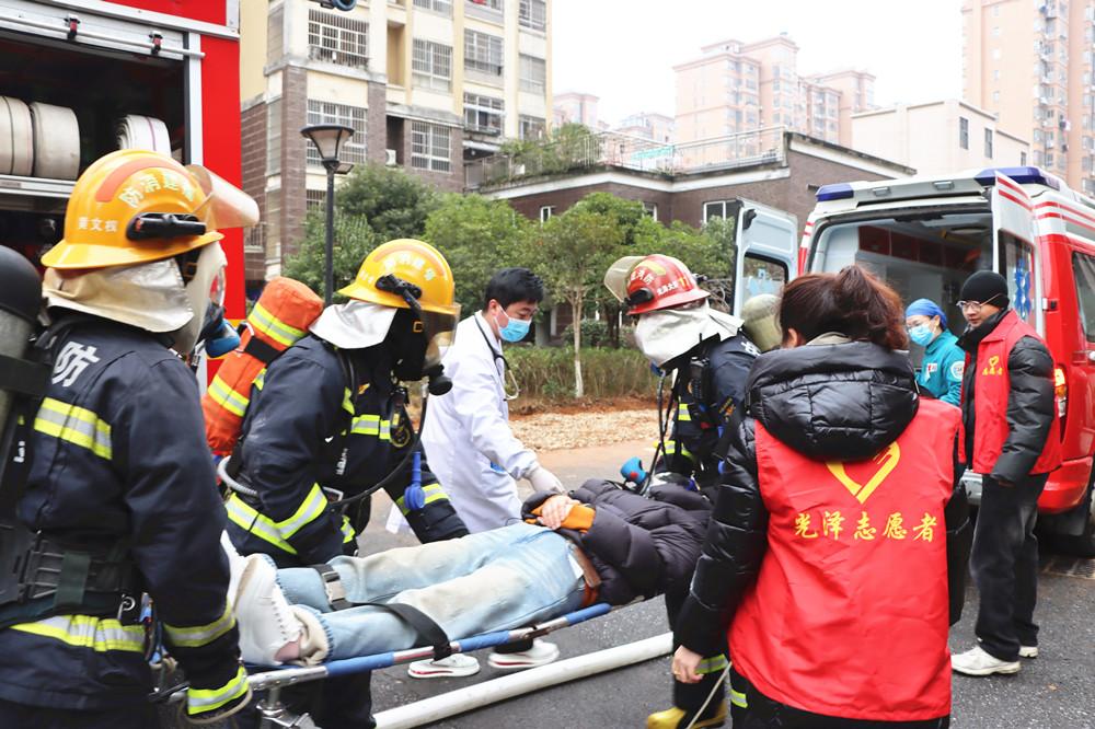 近日,光泽县消防救援大队牵头组织110指挥中心、120急救中心、电力公司、公安派出所、交警大队、三风社区及物业单位,在荣兴花园小区开展高层建筑灭火救援联合实战演练。图为演练现场。 |