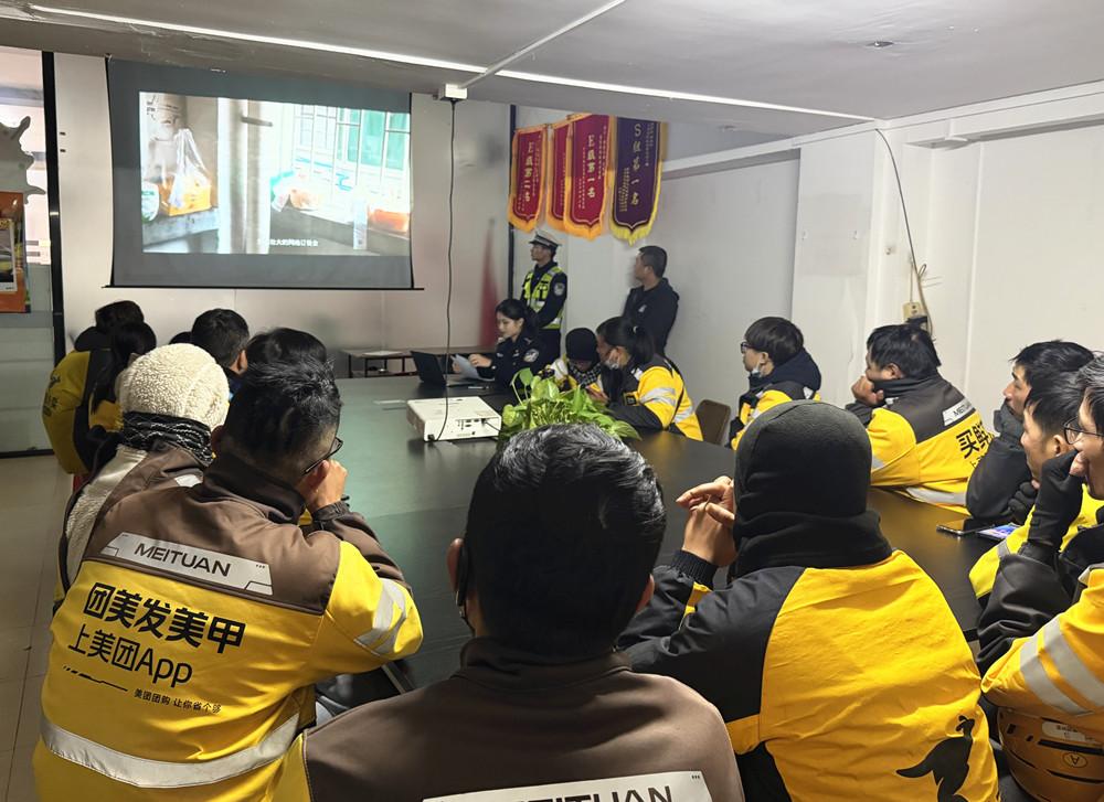 近日,惠安县公安局交通管理大队宣传民警走进外卖企业开展交通安全宣传活动。其间,民警结合辖区典型事故案例,剖析事故成因及危害,教育引导外卖骑手要严格遵守交通安全法律法规,在配送过程中正确佩戴安全头盔、不随意变道、不逆向行驶、骑车不接打电话。图为民警组织外卖骑手观看交通安全宣传片。 |
