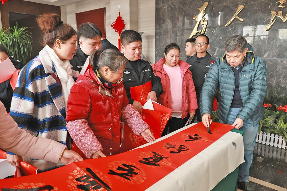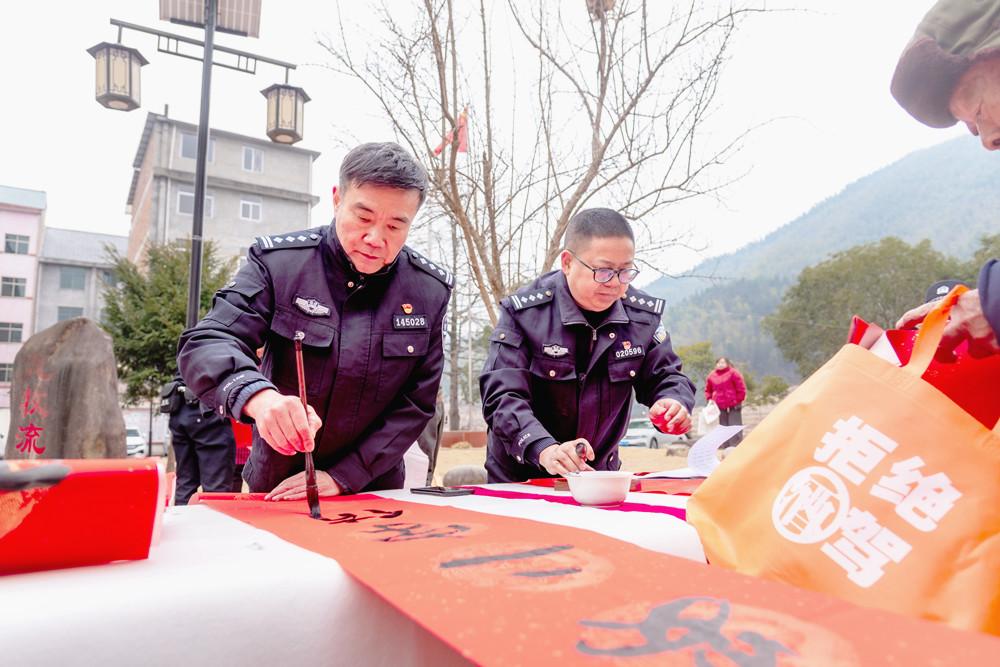 文艺小分队为基层民警辅警、群众送上新春祝福。 今年,福建公安“文化轻骑兵”下基层慰问活动包含写春联、送“福”字、公安文艺展示、趣味普法宣传等内容,书法、文艺、普法宣传3支小分队,历时一周,到7个基层单位,行程1640公里,将省公安厅党委的关心厚爱送到坚守在偏远地区维护安全稳定一线的民警辅警及广大群众中,让党群关系、警民关系更加和谐,让公安文化在八闽大地绽放更加灿烂的光芒。活动惠及民警辅警、群众近万人,累计送出春联、“福”字逾4000副,组织文艺展示、普法宣传10余场。 一纸福联映警徽 三省联动保畅安 1月22日,地处闽浙赣三省交界,驻守福建“北大门”的浦城县公安局九牧派出所辖区充满着欢声笑语。 书法小分队的公安书法家在空地支起桌案,为民警辅警、往返司机、返乡群众书写春联、送“福”字,一副副蕴含新春祝福、祝愿国泰民安的春联大受欢迎。活动还邀请浦城县“非遗”剪纸代表性传承人参与,把温情剪纸送到群众手中,以指尖技艺传递警民同心的暖意。