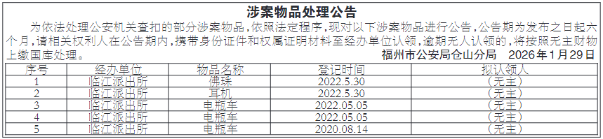漳州市芗城区人民法院公告 吴良弟、林凤英: 本院受理原告唐瑞章与被告吴良弟、林凤英民间借贷纠纷一案,现依法向你公告送达起诉状副本,应诉通知书,举证通知书,开庭传票,廉政监督卡等诉讼材料,自本公告发出之日起经过30日即视为送达。提出答辩状的期限和举证期限均为公告期满后的15日内,开庭日期定于举证期满后的第3日上午8时30分(遇节假日顺延)在本院第六法庭公开开庭审理,逾期将依法缺席判决。 漳州市芗城区人民法院 2026年1月29日 遗失声明 浦城县河滨丹桂农民专业合作社不慎遗失圆形铜质公章一枚(内书:浦城县河滨丹桂农民专业合作社;印章编码:3507220003229;规格:4.2cm),现声明作废。 浦城县河滨丹桂农民专业合作社 2026年1月29日 遗失声明 南平市玖荣贸易有限公司不慎遗失圆形铜质公章一枚(内书:南平市玖荣贸易有限公司;印章编码:35070310034018;规格:4.0cm),现声明作废。 南平市玖荣贸易有限公司 2026年1月29日 遗失声明 福州书宸网络科技有限公司遗失福州市仓山区市场监督管理2025年6月10日核发营业执照正本一份,统一社会信用代码:91350102MA8TN3NK1R,现声明作废。 福州书宸网络科技有限公司 2026年1月29日 遗失声明 福清市新厝王晓峰五金商行不慎遗失公章一枚,印章编号:35018110017585,现声明作废。 福清市新厝王晓峰五金商行 2026年1月29日 遗失声明 福安市哲辉商贸有限公司不慎遗失公章一枚及法人(吴梓贵)私章,现声明作废。 福安市哲辉商贸有限公司 2026年1月29日 遗失声明 南平市建安建材科技有限公司不慎遗失圆形铜质公章一枚(内书:南平市建安建材科技有限公司;印章编码:35070210011092;规格:4.0cm),现声明作废。 南平市建安建材科技有限公司 2026年1月29日 福州市台江区劳动人事争议仲裁委员会公告 福州灵动人力资源有限公司: 本委已立案受理申请人李中明诉你单位有关确认解 除劳动关系、工伤保险待遇争议仲裁案件,因你单位作为本 案被申请人且无法联系,根据《劳动人事争议仲裁办案规 则》第二十条第三款规定,现依法向你单位公告送达本委台 劳人仲案字[2026]第75号《被申请人参加仲裁通知书》、《仲 裁申请书》副本、证据副本、《开庭通知书》(开庭时间定为 2026年3月27日下午15时00分)。限你单位自本公告发 布之日起三十日内到本委(福州市台江区安南路18号群升 商务中心五楼台江区人力资源和社会保障局法规仲裁科 办公室)领取。逾期即视为送达,本委将依法审理。 福州市台江区劳动人事争议仲裁委员会 2026年1月28日 |