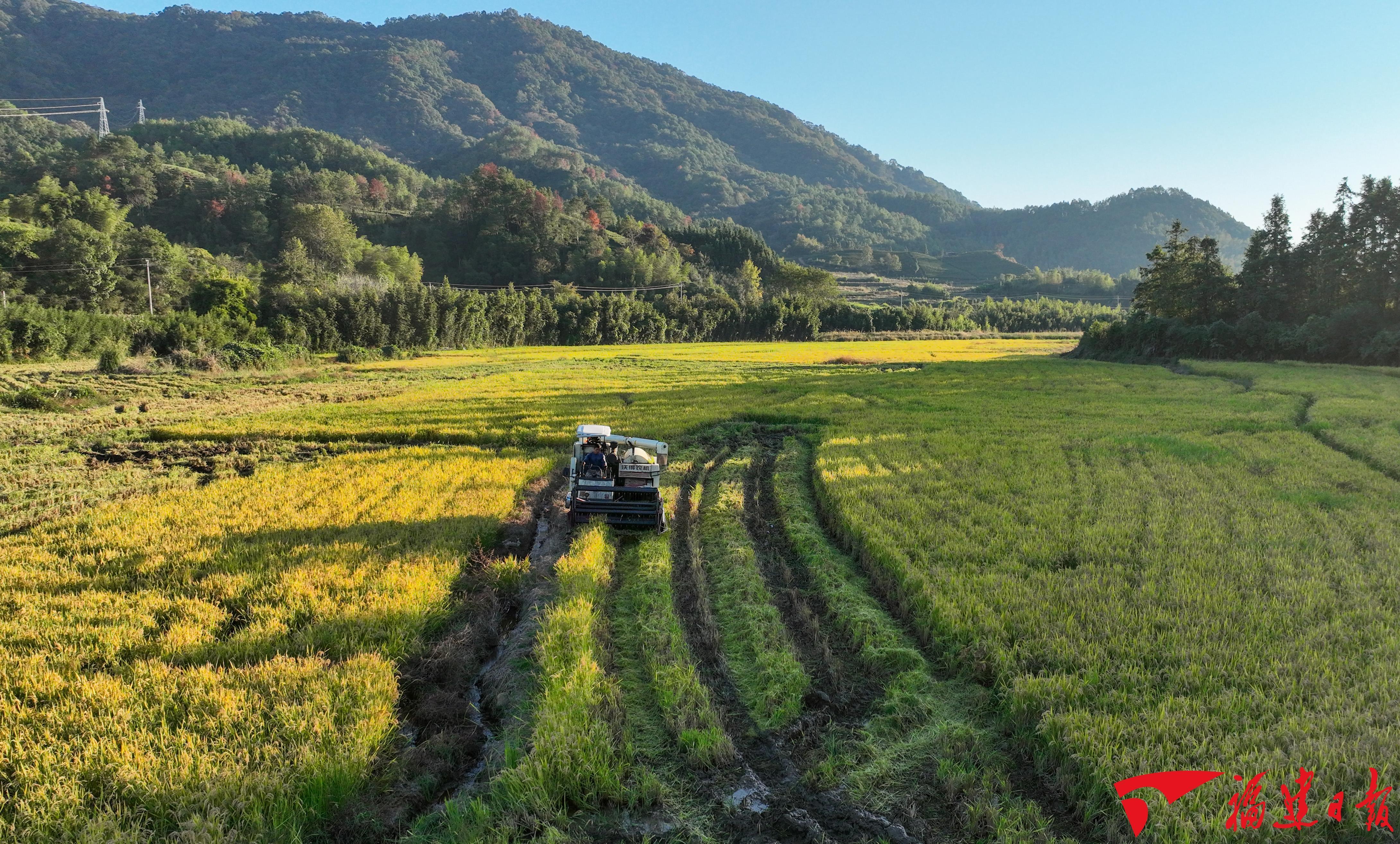 收割机在武夷山市张赵翰粮种植家庭农场收割再生稻二季(无人机照片) 山海福建,穰穰满家;粮安八闽,粒粒归仓。 “单打冠军”是如何炼成的 作为全国重要的“南菜北运”基地,全省每年40%蔬菜调供省外;银耳、绣球菌、秀珍菇等8种食用菌产量居全国首位;茶产业全产业链产值位居全国第一;水产品人均占有量、出口额均位居全国第一……