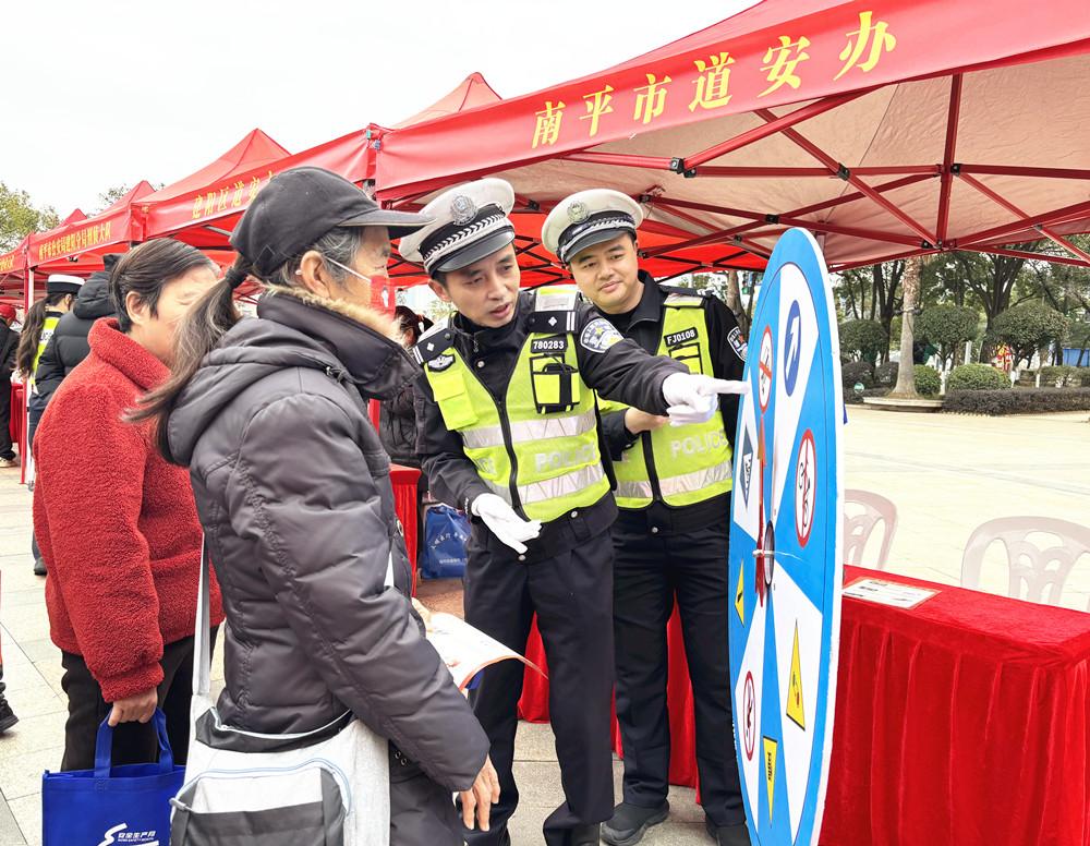 2月2日上午,南平市区两级道安办、公安交警等多部门在建阳区潭山公园举行春运启动日主题交通安全宣传活动。图为交警向群众宣传春运出行安全知识。 |
