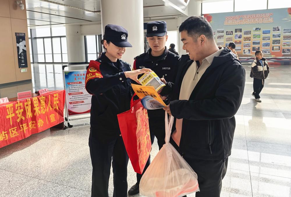 民警向旅客讲解春运安全出行须知。 活动期间,民警与各单位宣传人员深入车站进站口、候车大厅、售票厅等客流密集区域,通过设立联合咨询台、悬挂主题横幅、陈列宣传展板、发放安全知识手册和宣传单页等多种形式,向广大出行旅客宣传乘车安全须知、防盗防骗技巧、铁路安全法规、爱路护路知识以及突发事件应急应对措施等。 此次联合宣传活动,进一步增强了旅客的安全意识和法治观念,营造“平安、有序、温馨”的春运出行环境。 |