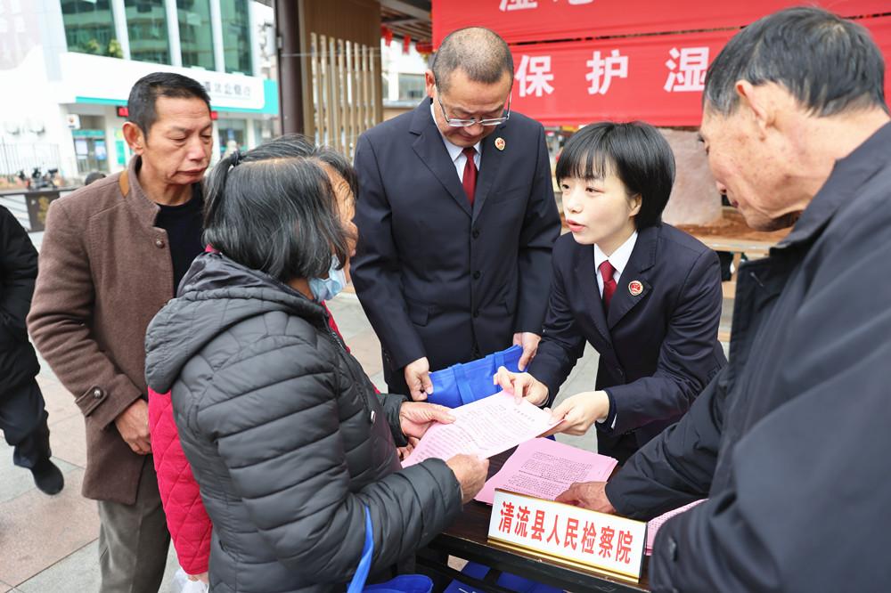 近日,清流县检察院联合县自然资源局、公安局等部门,在龙津广场开展湿地保护普法宣传活动。图为检察官向群众发放湿地保护宣传材料。 |