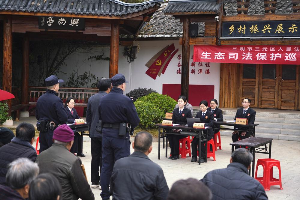 近日,三明三元法院法官走进三元区洋溪镇,公开审理一起非法制造枪支、非法狩猎刑事案件,数十名村民、村干部参与庭审旁听。图为庭审现场。 |