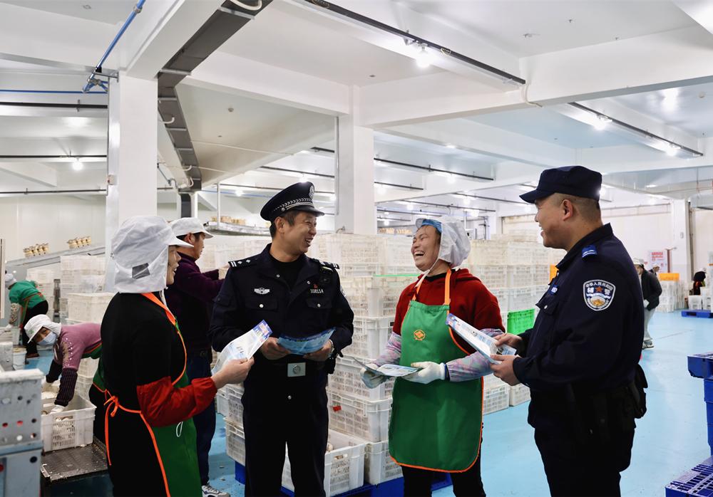 近日,漳州市公安局高新区分局组织民警辅警到社区、企业、公园等人员密集场所开展安全宣传活动。图为民警辅警向企业员工发放宣传手册。 |