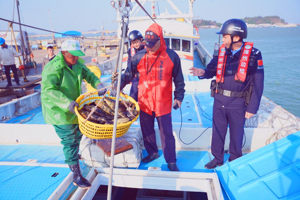 为保障两岸水产高效通关,漳州边检站开通“绿色通道”,实现船舶到港、查验、通关“零等待”。2月2日,随着台湾渔船“昇亿发”轮和“金海发 26”轮先后靠港,漳州港区今年累计接卸活鱼船舶已突破50艘次,较去年同期增长43.75%。图为边检站民警与台胞船员沟通近期渔获情况。 |