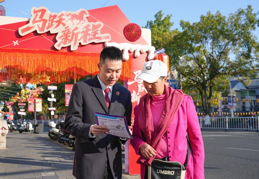 近日,龙岩市新罗区检察院组织干警前往中山路金融街开展防范电信网络诈骗宣传活动。图为干警向群众发放宣传资料,揭示当前高发电诈骗局,并传授相关防范方法。 |