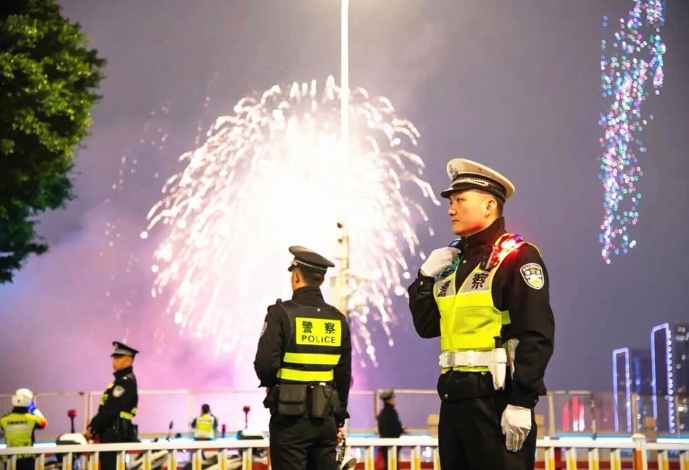 福州市公安局交通管理支队台江大队民警在烟花无人机秀现场执行交通保障任务。(王勍潇 摄)