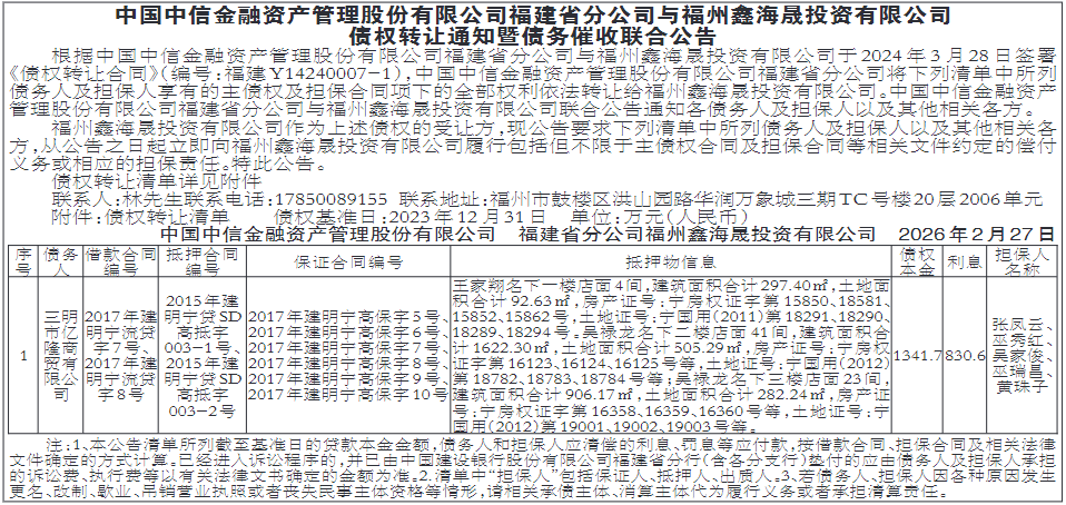公告 2026年1月21日,福建省三明市中级人民法院根据福建三明农村商业银行股份有限公司列西支行的申请,作出(2026)闽04破申10号民事裁定书,裁定受理三明三杉木业有限公司(以下简称三杉木业公司)破产清算一案。经随机摇号,选定福建远东大成(三明)律师事务所作为三明三杉木业有限公司管理人。三明三杉木业有限公司的债权人应于财产分配前尽快向管理人(通讯地址:三明市三元区福清商会大厦16层1601-1602福建远东大成(三明)律师事务所:联系人:余昌锭律师;联系电话:17750052871)申报债权。逾期申报者,不得依照《企业破产法》规定的程序行使权利,已分配的财产不对其补充分配,破产财产最后分配前补充申报的,此前已分配的财产不再补充分配,且应承担因审查,确认补充债权产生的费用。三明三杉木业有限公司的债务人或财产持有人应尽快向管理人清偿债务或交付财产。此外,清流县人民法院定于2026年4月9日上午9:00在清流县人民法院第九法庭以现场方式(如有变化另行通知)召开该破产案件的第一次债权人会议。 三明三杉木业有限公司管理人 2026年2月27日 关于颁(换)发《中华人民共和国保险许可证》的公告 因地址变更,经国家金融监督管理总局福建监管局批准,换领《中华人民共和国保险许可证》,现予以公告! 1、机构名称:英大泰和人寿保险股份有限公司福建分公司 许可证流水号:00160417 批准日期:2008年04月17日 机构住所:福建省福州市仓山区西三环路19号金山橘园工业园区项目D1#塔楼12层1201—1205室、1208—1218室 机构编码:000121350000800 业务范围:上级机构在保险监督管理机构批准的业务范围内授权的业务 发证机关:国家金融监督管理总局福建监管局 发证日期:2026年01月29日 负责人:邓海燕 邮政编码:350000 联系电话:0591-88317381 经营区域:福建省行政区域 2、机构名称:英大泰和人寿保险股份有限公司仓山营销服务部 许可证流水号:00160423 批准日期:2008年07月03日 机构住所:福建省福州市仓山区西三环路19号金山橘园工业园区项目D1#塔楼12层1206室、1207室 机构编码:000121350104001 业务范围:上级机构在保险监督管理机构批准的业务范围内授权的业务 发证机关:国家金融监督管理总局福建监管局 发证日期:2026年02月12日 负责人:阮章斌 邮政编码:350000 联系电话:0591-28070088 经营区域:福建省行政区域 注销公告 晋安区鼓山镇融东社区卫生服务站(统一社会信用代码:52350111691923284R)拟办理注销登记手续,已于2026年2月25日成立清算组,为保护债权人的合法权益,自本公告发布之日起45日内,请债权人向本单位清算组申报债权,逾期视为放弃。 联系人:邹沙凌 联系电话:13860606086联系地址:福建省福州市晋安区鼓山镇连潘村71号 晋安区鼓山镇融东社区卫生服务站 2026年2月27日 遗失声明 福清市鑫安福生态农业综合开发有限公司不慎遗失公章一枚,编码3501810040778,现声明作废。 福清市鑫安福生态农业综合开发有限公司 2026年2月27日 遗失声明 莆田市城建管线服务有限公司遗失福建广电网络集团股份有限公司莆田分公司开具的荔城区新度片区棚改项目(一期)有线电视网络建设工程发票,发票代码3500223130,发票号码07200829,金额:498824.59元,声明作废。 莆田市城建管线服务有限公司 2026年2月27日 遗失声明 福州叶发贸易有限公司不慎遗失公章一枚。编码:35011110117705,声明作废。 福州叶发贸易有限公司 2026年2月27日 关于农民工工资专用账户销户的公告 福州经济技术开发区高新工业园区排水管网工程(一期)第二标段(施工)项目已于2025年12月17日竣工验收,农民工已全部离场,项目部已按时足额结清全部农民工工资。如有疑问请致电联系电话。特此公示! 公告时间:2026年3月1日-2026年3月31日 联系人:许飞联系电话:13799404306 福州市马尾区人力资源和社会保障局:83986729 中锦骏业建设有限公司 2026年2月27日 声明 曾小燕身份证信息泄露,身份证号码350581199902281224,特此声明。 声明人:曾小燕 2026年2月27日 遗失声明 宁德市利鹏进出口有限公司遗失公章一枚,编码:35090210029242,法人(彭丽玲)私章一枚,编码:35090210029243, 现声明作废。 宁德市利鹏进出口有限公司 2026年2月27日 福州市台江区劳动人事争议仲裁委员会公告 福州市台江区朗朗家政有限公司: 本委已立案受理申请人周雅婷诉你单位有关确认劳动关系、劳动报酬、赔偿争议仲裁案件,因你单位作为本案被申请人且无法联系,根据《劳动人事争议仲裁办案规则》第二十条第三款规定,现依法向你单位公告送达本委台劳人仲案字[2026]第111号《被申请人参加仲裁通知书》、《仲裁申请书》副本、证据副本、《开庭通知书》(开庭时间定为2026年4月23日上午10时30分)。限你单位自本公告发布之日起三十日内到本委(福州市台江区安南路18号群升商务中心五楼台江区人力资源和社会保障局法规仲裁科办公室)领取。逾期即视为送达,本委将依法审理。 福州市台江区劳动人事争议仲裁委员会 2026年2月27日 |