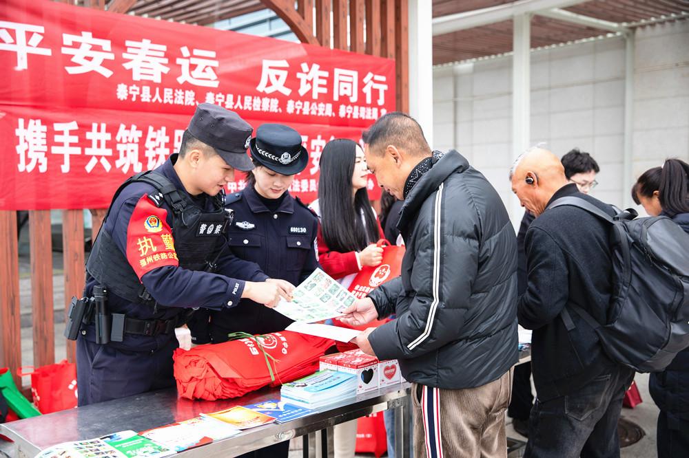 近日,泰宁县公安局联合多部门在泰宁动车站开展“平安春运 反诈同行”主题宣传活动,为春运旅途筑牢安全防线。图为民警向群众讲解铁路安全知识。 |