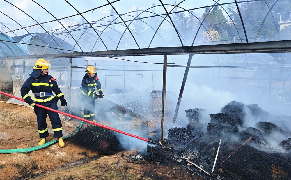 灭火后,消防救援人员对大棚内堆积物持续出水降温。 根据现场情况,指挥员立即下达作战命令:警戒组对现场实施警戒,疏散周边围观群众,确保救援现场安全有序;灭火组铺设水带干线,出动水枪从不同方位对火势进行夹击扑救,并对周边受火势威胁的区域进行冷却阻截。经过约40分钟的紧张扑救,现场明火被成功扑灭。 随后,消防救援人员对现场展开清理和排查,利用火钩翻刨大棚内堆积物,并持续出水降温,确认无复燃可能后整理器材归队。 |