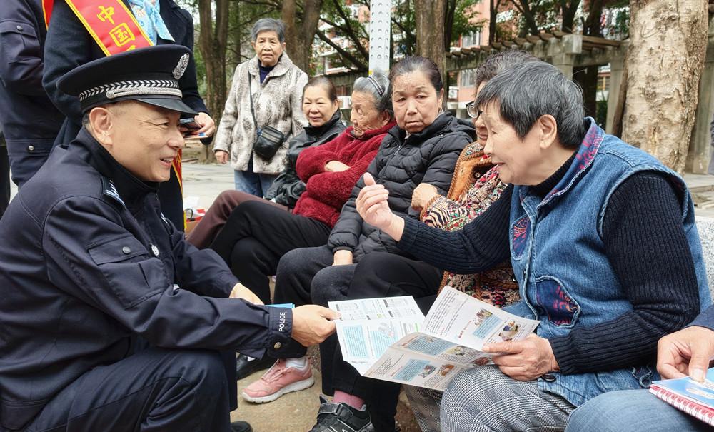 近日,福州市公安局鳌峰派出所民警联合辖区银行,走进鳌峰苑小区开展“警银联手防诈骗 守护老人‘钱袋子’”反诈宣传活动,用贴心服务为老年人筑起一道坚实的“安全防护墙”。图为民警向老年人讲解反诈知识。 |