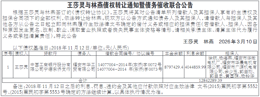 公告 福建宝标秋业建设工程有限公司: 你公司在福清市海洋牧场控爆项目因准予行政许可所依据的客观情况发生重大变化,根据《中华人民共和国行政许可法》第八条之规定,拟撤回你公司“福清市国家级海洋牧场陆域配套三期控爆区、四期1、五期2石方控制爆破工程项目”行政许可。我局民警于3月6日前往你公司告知,因法人不在场,已发函告知,请你公司在公告期内向我局提出陈述和申辩意见,逾期将按相关规定处理。 福清市公安局 2026年3月10日 注销公告 滴滴出行科技有限公司宁德分公司(91350901MA337QXR58)核实部分车辆已不符合安全营运条件,存在较大安全隐患漏洞,乘客生命财产安全无法得到有效保障。现对已办理《网络预约出租汽车运输证》的失联车辆:闽JD09759、闽JD07970、闽JD53168、闽JD56567、闽JD58128、闽JD51399、闽JD09905、闽JD51918、闽JD58687、闽JD50505、闽JD50556、闽JD08186、闽JD19837、闽JD66560、闽JD26601、闽JD09283、共计16辆(渐变绿色)于公告7日后依法办理注销。 特此公告。 滴滴出行科技有限公司宁德分公司 2026年3月10日 福州星宸未来酒店管理有限公司: 本会受理申请人邱达芳与被申请人福州星宸未来酒店管理有限公司、福州铭睿酒店有限公司、宋庆华、王文贺之间的民间借贷纠纷案[(2025)榕仲受200号],经本会依法缺席审理,已于2024年12月4日作出(2025)榕仲裁200号《裁决书》。《裁决书》自作出之日起发生法律效力。请于本公告发出之日起60日内到本会领取《裁决书》。本公告自发出之日起60日即视为送达。 福州仲裁委员会 2026年3月10日 李妮娜: 本会受理申请人安徽热娱文化传播有限公司与被申请人李妮娜之间的合同纠纷案[(2026)榕仲受69号],现向你公告送达《案件受理通知书》《仲裁规则》《仲裁员名册》《仲裁申请书》及证据材料等。本公告自发出之日起60日即视为送达。答辩、选定仲裁员期限为公告期满后10日内,举证期限为公告期满后10日内。本案将于选定仲裁员期限届满后第一个工作日组成仲裁庭,于2026年6月8日下午15:30在本会第五仲裁室开庭审理。请于仲裁庭组成后第一个工作日到本会领取《仲裁庭组成人员通知书》《开庭通知书》,逾期,视为送达。 福州仲裁委员会 2026年3月10日 福州俊德辉房地产开发有限公司: 本会受理申请人闽侯县自然资源和规划局与被申请人福州俊德辉房地产开发有限公司之间的建设用地使用权出让合同纠纷案[(2025)榕仲受964号],现向你公告送达《案件受理通知书》《仲裁规则》《仲裁员名册》《仲裁申请书》及证据材料等。本公告自发出之日起60日即视为送达。答辩,选定仲裁员期限为公告期满后15日内,举证期限为公告期满后20日内。本案将于选定仲裁员期限届满后第一个工作日组成仲裁庭,于2026年6月9日上午09:30在本会第五仲裁室开庭审理。请于仲裁庭组成后第一个工作日到本会领取《仲裁庭组成人员通知书》《开庭通知书》,逾期,视为送达。 福州仲裁委员会 2026年3月10日 廖良勇、伊犁乐业房地产开发有限公司: 本会受理申请人李锦华与被申请人廖良勇、伊犁乐业房地产开发有限公司之间的民间借贷纠纷案[(2025)榕仲受2646号],现向你们公告送达《案件受理通知书》《仲裁规则》《仲裁员名册》《仲裁申请书》及证据材料等。本公告自发出之日起60日即视为送达。答辩,选定仲裁员期限为公告期满后15日内,举证期限为公告期满后20日内。本案将于选定仲裁员期限届满后第一个工作日组成仲裁庭,于2026年6月10日下午15:00在本会第五仲裁室开庭审理。请于仲裁庭组成后第一个工作日到本会领取《仲裁庭组成人员通知书》《开庭通知书》,逾期,视为送达。 福州仲裁委员会 2026年3月10日 遗失声明 福建旭轩建设有限公司遗失三明市沙县区交通运输局颁发的福建省道路运输证一份,车号:闽GB6265(重型自卸货车),运输证号:闽350405200570,现声明作废。 福建旭轩建设有限公司 2026年3月10日 遗失声明 永安旭川物流有限公司遗失车号为闽GB9622(黄色)的中华人民共和国道路运输证一本,证号:闽交运管明字350481203592号,声明作废。 永安旭川物流有限公司 2026年3月10日 社会组织注销登记债权债务 清算公告 根据国务院《民办非企业单位登记管理暂行条例》,武平县汇晟游泳健身俱乐部(统一社会信用代码:52350824MJB6912504)经理事会决议,拟终止相关业务,进行债权债务清理。请对武平县汇晟游泳健身俱乐部享有债权或负有债务的组织和个人,于本公告发布之日起45日之内向清算组申请债权或者确认债务,逾期后果自负。 清算组联系人:李兴斌 联系电话:13950892803 武平县汇晟游泳健身俱乐部 2026年3月10日 遗失声明 福州捷顺达储运有限公司遗失公章一枚,编码:3501020104144,现声明作废。 福州捷顺达储运有限公司 2026年3月10日 遗失声明 冠林电子有限公司(统一社会信用代码:9135010562863544X3)不慎遗失冠林电子有限公司马尾安置房项目专用章一枚,声明作废。 冠林电子有限公司 2026年3月10日 福州市台江区劳动人事争议仲裁委员会公告 台江区展辉首饰店: 本委已立案受理申请人李明辉诉你单位有关解除劳动合同的赔偿金、未签订书面劳动合同的二倍工资差额等劳动争议仲裁案件,因你单位作为本案被申请人且无法联系,根据《劳动人事争议仲裁办案规则》第二十条第三款规定,现依法向你单位公告送达本委台劳人仲案字(2026)第154号