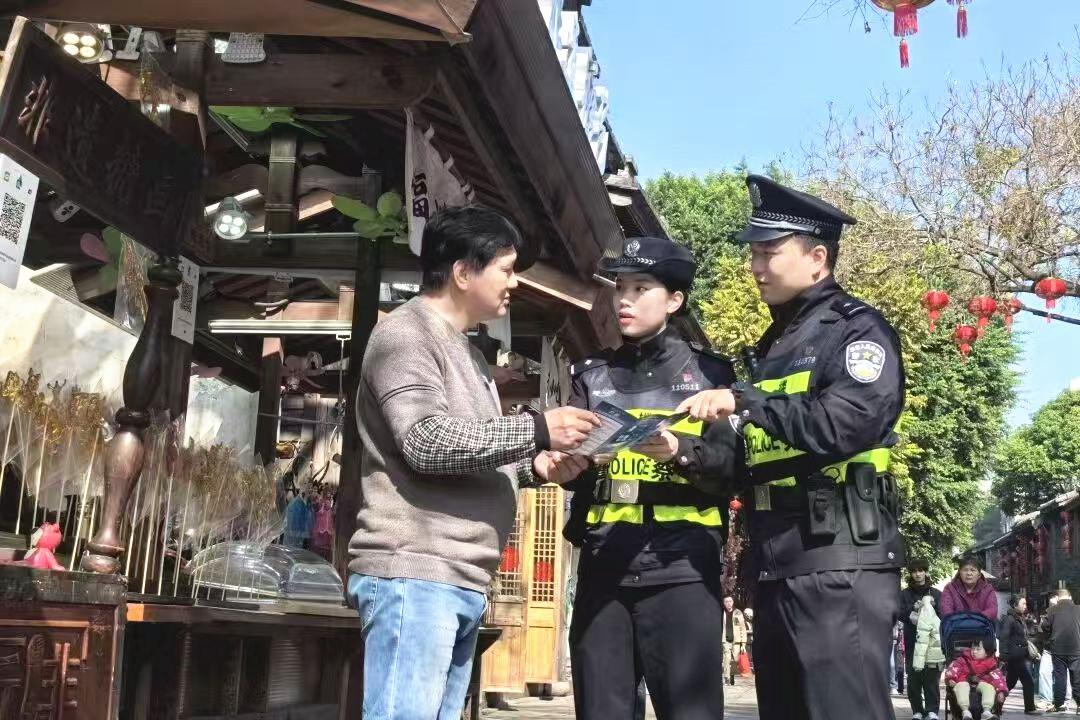 近日,福州市公安局南街派出所民警深入三坊七巷历史文化街区,开展反诈宣传活动。图为民警向群众和商户发放反诈宣传手册,细致揭示电信网络诈骗的常见套路。 |