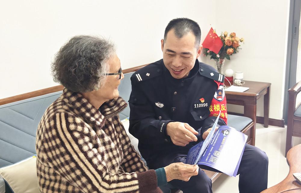 近日,福州市公安局鼓楼分局洪山派出所组织民警走进辖区独居老人家中,开展慰问帮扶、反诈宣传等活动,让关爱直抵老人心中。图为民警向独居老人曾阿姨讲解反诈知识。 |