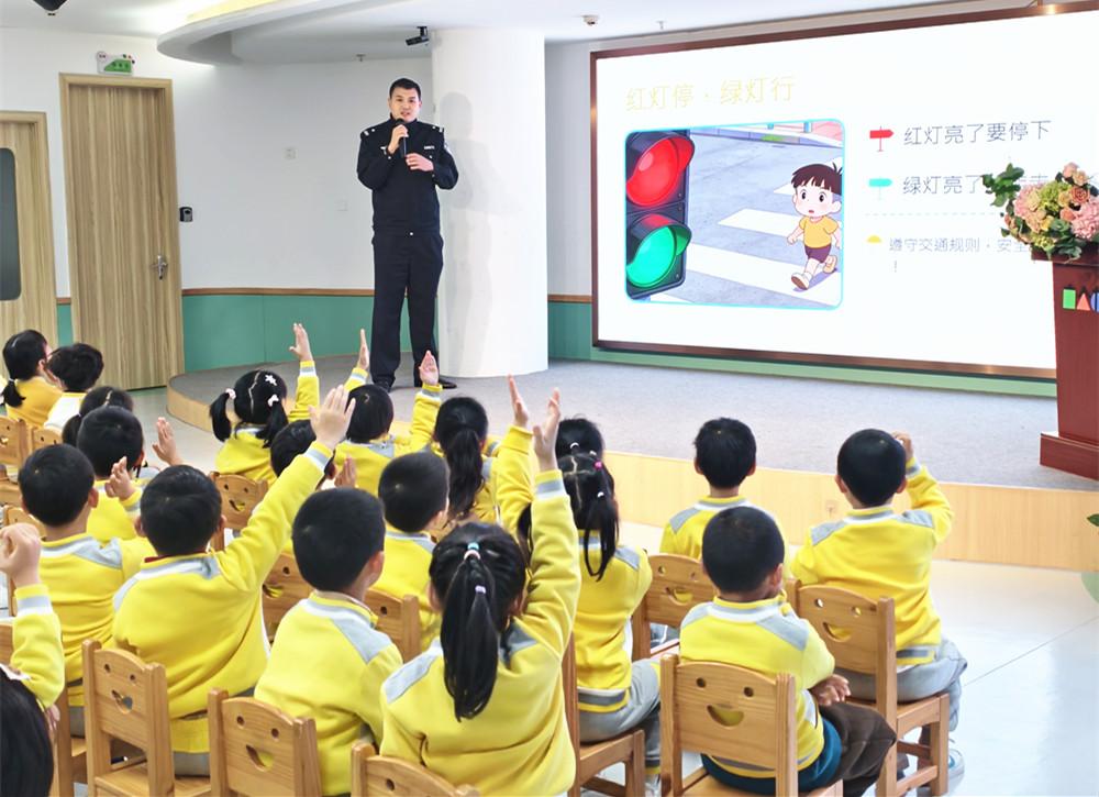 近日,福州市公安局新港派出所民警走进南公幼儿园,开展“平安伴童年 安全我知道”主题安全教育活动。图为民警与孩子们互动交流。 |