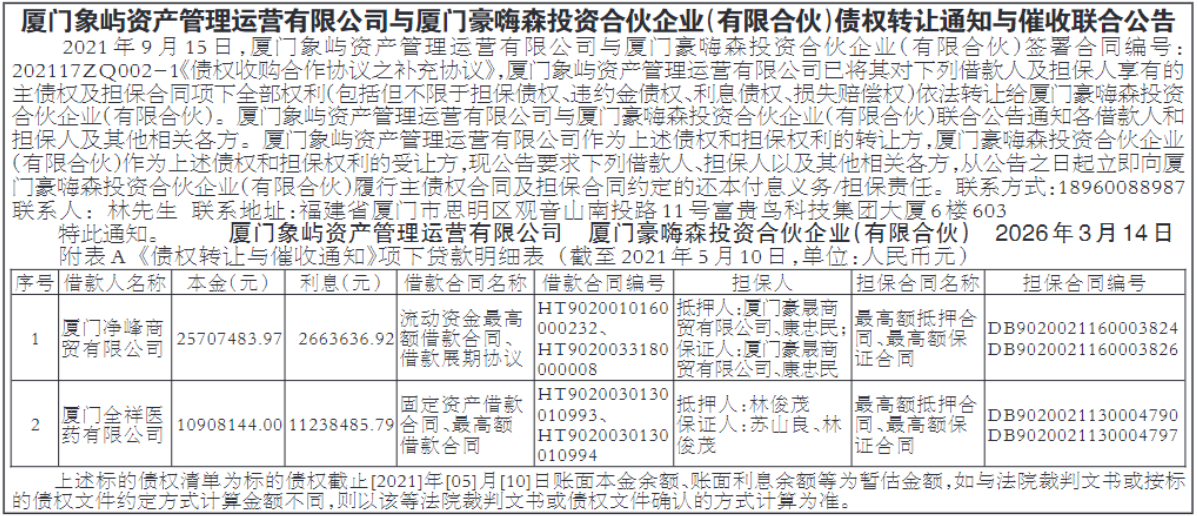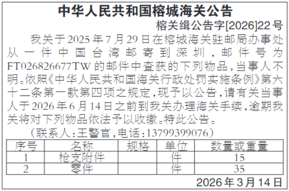 公告 福建宝标秋业建设工程有限公司: 你公司在福清市海洋牧场控爆项目因准予行政许可所依据的客观情况发生重大变化,根据《中华人民共和国行政许可法》第八条之规定,拟撤回你公司“福清市国家级海洋牧场陆域配套三期控爆区、四期1、五期2石方控制爆破工程项目”行政许可。我局民警于3月6日前往你公司告知,因法人不在场,已发函告知,请你公司在公告期内向我局提出陈述和申辩意见,逾期将按相关规定处理。 福清市公安局 2026年3月14日 认领公告 2026年2月13日,宁德海警局福鼎第一工作站执法艇在福鼎市沙埕镇台山岛附近海域(北纬26°59′12″,东经120°42′30″)查获两艘未涂刷船名船号的钢制船舶。经查:一条船船长约13米,船宽约4米,驾驶台为灰色,船身为蓝色,水线以下为红色;另一条船船长约13米,船宽约4米,驾驶台为蓝色,船身为蓝色,水线以下为红色。经多方调查和查找,仍无法找到及联系到该涉案船舶所有人。现依法公告,请船舶所有人自公告之日起六个月内持相关合法、齐全手续证明到我单位认领并说明情况,逾期未认领的,将依法予以处置。 联系电话:05937581999,联系地址:宁德市福鼎市沙埕镇岙口村旧城1号。 宁德海警局福鼎第一工作站 2025年3月14日 认领公告 根据《公安机关涉案财物管理若干规定》(公通字【2015】21 号)第二十一条之规定,现依法对以下涉案款项予以公告,自公告之日起六个月内,请以下涉案款项的原主或当事人持合法手续及身份证明到泉州市公安局认领。逾期无人认领的,将按无主财物处理,依法上缴国库。 联系电话:0595-22180636 1、蔡荣等案件扣押款,23100 元 2、1.29 陈怡平案件交款,27,999.00 元 3、蔡其伟案件暂扣款,1,860.00 元 4、清源所案件暂扣款,24,700.00 元 5、蔡连招案件暂扣款,500,000.00 元 6、颜大鹏案件暂扣款,234,000.00 元 7、林火龙案件暂扣款,85,669.00 元 8、郑秀娟案件暂扣款,20,000.00 元 9、陈美容案件暂扣款,250,000.00 元 10、刘建明案件扣押款,10,000.00 元 11、李俊仁案件罚款,1,000.00 元 12、陈志莲案件暂扣款,300,000.00 元 13、陈德良案件暂扣款,50,000.00 元 14、王水阳案件暂扣款,5.00 元 15、林铖淼案件暂扣款,1,000.00 元 16、张鸿生案件暂扣款,4,000.00 元 17、林幸福案件暂扣款,3,000.00 元 18、叶鸣案件暂扣款,3,000.00 元 19、许春怀案件暂扣款,17,000.00 元 20、许雅龙案件暂扣款,11,700.00 元 21、许国强案件暂扣款,3,000.00 元 22、陈南胜案件暂扣款,1,600.00 元 23、林希萍案件暂扣款,2,000.00 元 泉州市公安局 2026年3月14日 遗失声明 原福州市台江区市场监督管理局执法人员叶伟斌,行政执法证(编号:13010230097)因保管不当不慎遗失,现声明予以作废。 福州市台江区市场监督管理局 2026年3月14日 遗失声明 福建省煤炭运销有限公司遗失福建省煤炭运销有限公司福州分公司公章一枚,遗失福州经济技术开发区市场监督管理局2000年05月17日核发的营业执照正副本,声明作废。 福建省煤炭运销有限公司 2026年3月14日 陈兰兰: 本会受理申请人福建观松律师事务所与被申请人陈兰兰之间的诉讼、仲裁、人民调解代理合同纠纷案[(2025)榕仲受1150号],经本会依法缺席审理,已于2026年1月29日作出(2025)榕仲裁1150号《裁决书》。《裁决书》自作出之日起发生法律效力。请于本公告发出之日起60日内到本会领取《裁决书》。本公告自发出之日起60日即视为送达。 福州仲裁委员会 2026年3月14日 陈碧琼: 本会受理申请人北京金辉锦江物业服务有限公司福清分公司与被申请人陈碧琼之间的物业服务合同纠纷案[(2025)榕仲受2593号],现向你公告送达《案件受理通知书》《仲裁规则》《仲裁员名册》《仲裁申请书》及证据材料等。本公告自发出之日起60日即视为送达。答辩、选定仲裁员期限为公告期满后10日内,举证期限为公告期满后10日内。本案将于选定仲裁员期限届满后第一个工作日组成仲裁庭,于2026年6月5日上午10:00在本会第三仲裁室开庭审理。请于仲裁庭组成后第一个工作日到本会领取《仲裁庭组成人员通知书》《开庭通知书》,逾期,视为送达。 福州仲裁委员会 2026年3月14日 遗失声明 三明市宇嘉航物流有限公司遗失车号为闽GA9171(黄色)的中华人民共和国道路运输证一本,证号:闽交运管明字350481203942号,声明作废。 三明市宇嘉航物流有限公司 2026年3月14日 债权转让通知书: 周志勇先生: 根据(2023)闽0783民初1400号民事判决书所产生的黎志华与你的债权,现黎志华已将该债权转让给黎国书,现正式向你告知,该案申请执行人黎志华将变更为申请执行人黎国书。 此致 通知人:黎志华 2026年3月14日 清算公告 南平市建阳区徐市镇欣欣幼儿园经理事会会议决议注销并清算,现已成立清算组进入清算阶段,请有关债权人于见报之日起45日内向清算组申报债权及办理债权登记手续。 地址:南平市建阳区徐市镇 联系人:吕兰英电话:13559848425 南平市建阳区徐市镇欣欣幼儿园 2026年3月14日 遗失声明 福州市长乐创福贸易有限公司遗失公章一枚,编号35018210043167,声明作废。 福州市长乐创福贸易有限公司 2026年3月14日 遗失声明 福州金工热喷涂技术有限公司不慎遗失公章一枚,现声明作废。 福州金工热喷涂技术有限公司 2026年3月14日 遗失声明 福清市烟花爆竹管理协会,统一社会信用代码:51350181MJB6179230不慎遗失社会团体法人登记证书正本和副本及公章一枚,公章编码:35018110014884,现声明作