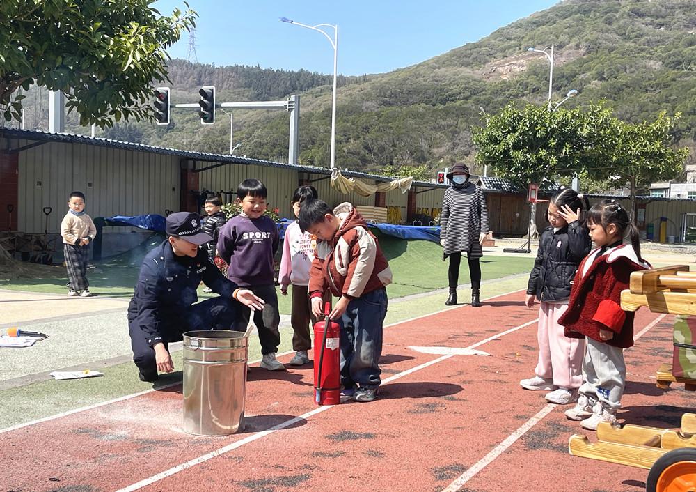 近日,平潭综合实验区公安局金井支队民警深入辖区金井幼儿园开展消防应急演练活动,为全园师生讲授消防安全知识,筑牢校园安全防线。图为民警现场示范消防器材使用方法,并指导幼儿实操体验。 |