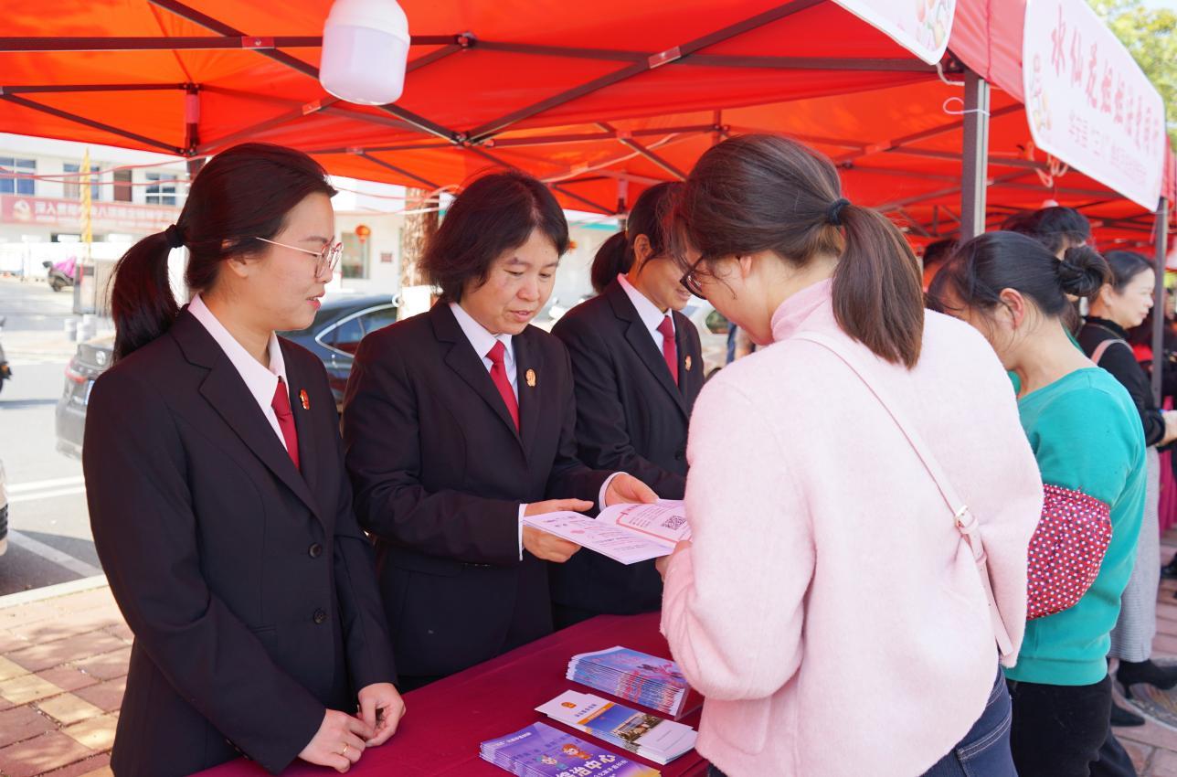 近日,华安法院协同多家单位开展平安福建宣传月暨“水仙花姐姐法爱同行”普法宣传活动。图为法院干警向群众分发法治宣传资料。 |