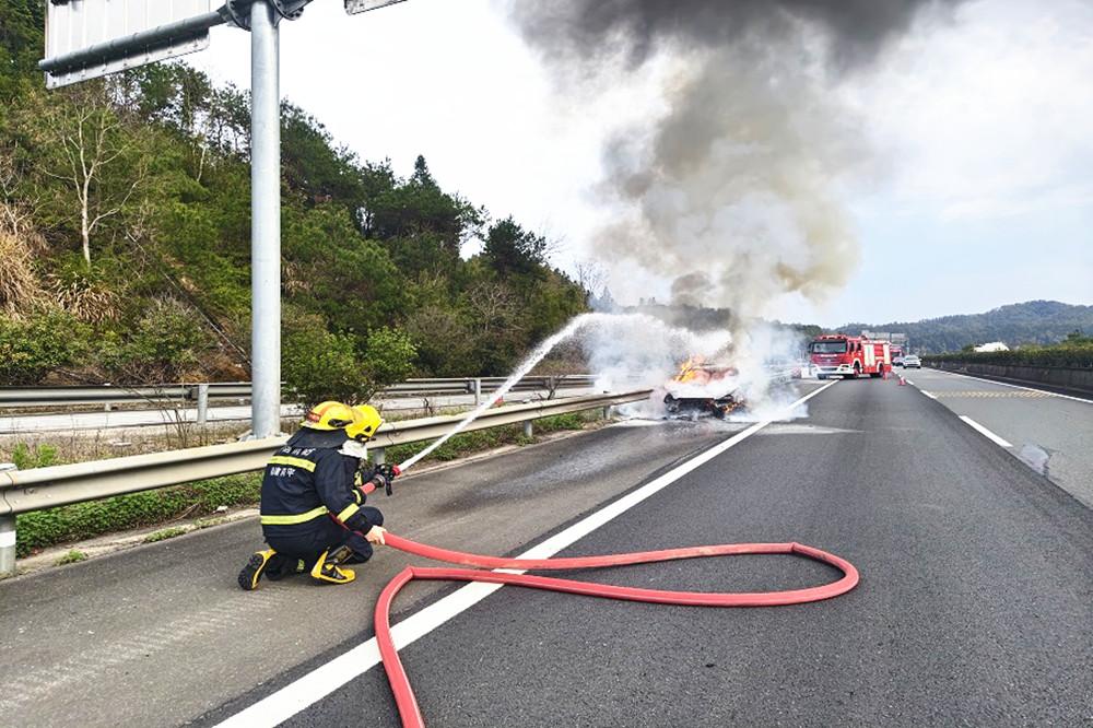 本报讯 近日,一辆小车在行驶中发生自燃,南平市建阳区消防救援人员经过20多分钟处置成功扑灭明火。 当天16时4分,建阳区消防救援局接到报警:高速南平北收费站往浦城方向2公里处,一辆汽车发生自燃。崇泰消防救援站立即前往处置。