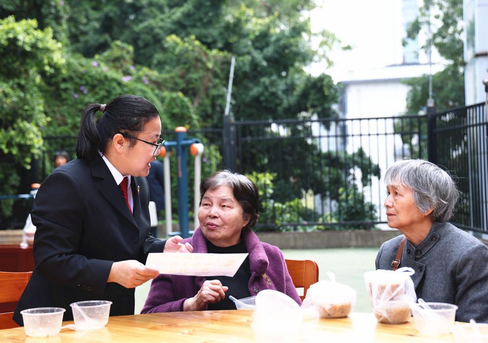 法官向老年人开展普法宣传。(福州中院供图) 活动现场,党员志愿者精心布置宣传阵地,通过悬挂横幅、摆放普法展板、播放普法视频以及发放宣传手册等形式,为社区居民尤其是老年群体送上“法治大餐”。针对老年群体消费维权意识薄弱、易陷入消费陷阱的特点,党员法官结合民商事审判实务,用通俗易懂的语言讲解消费者权益保护法、民法典等法律知识,并围绕保健品诈骗、预付卡纠纷、虚假宣传等常见问题进行以案释法,手把手指导老年人依法维护自身合法权益。同时,志愿者耐心解答居民提出的法律疑问,并提供一对一法律咨询服务。 同时,党员志愿者为社区老人送上拗九粥等,与老人亲切交谈,细心询问老人的生活状况和身体情况,传递党组织的关怀与温暖。此次活动将法治宣传与传统民俗相结合,既守护了群众的消费安全,又弘扬了孝善文化,让老人在感受节日温馨的同时,提升法治素养。 |