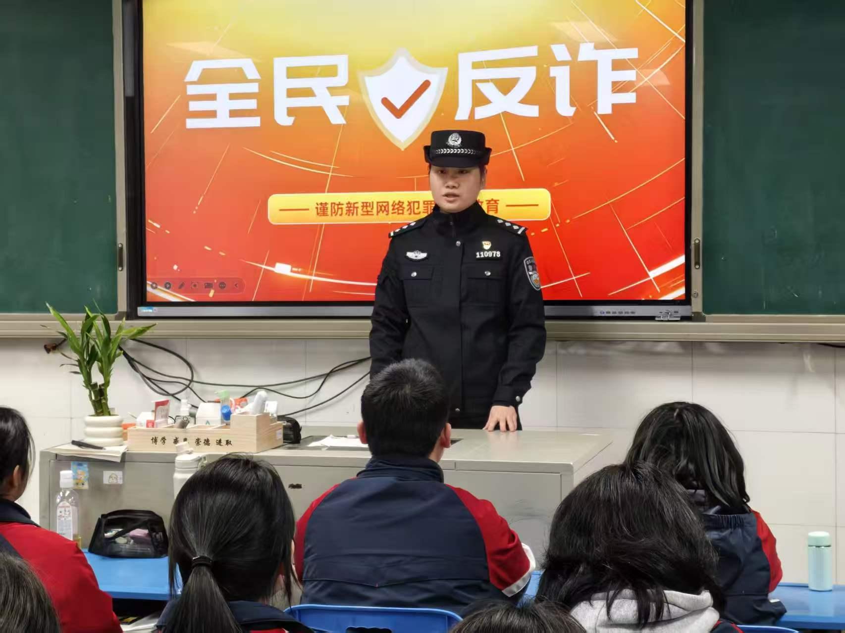 近日,福州市公安局水部派出所民警到闽江学院附属中学开展反诈宣讲活动。图为民警向学生讲解反诈知识。 |
