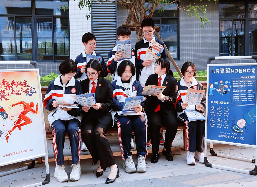 近日,龙岩新罗法院村居法官走进龙岩市第二中学东山校区,对初二学生开展法治宣传教育活动。图为法官向学生讲解禁毒、反诈法律知识。 |