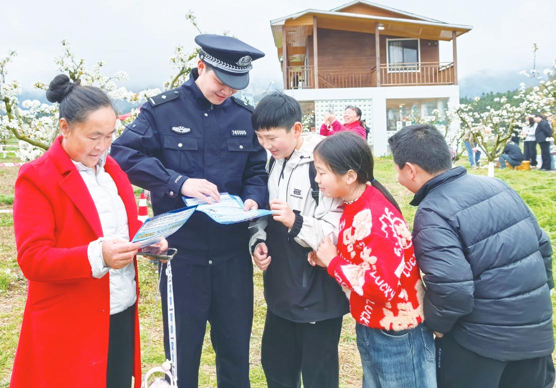 近日,光泽县李坊乡梨园梨花盛放,光泽县公安局将反诈宣传深度融入文旅场景,把千亩花海变为全民反诈的“流动课堂”。图为民警向游客宣传反诈知识。 |