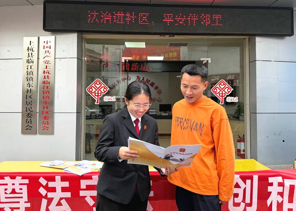 近日,上杭县人民法院在临江镇镇东社区组织开展平安福建宣传月普法宣传活动,通过走访入户、设立普法宣传点、发放宣传材料等形式,进一步提升群众维权能力。图为干警向群众讲解家事审判典型案例。 |