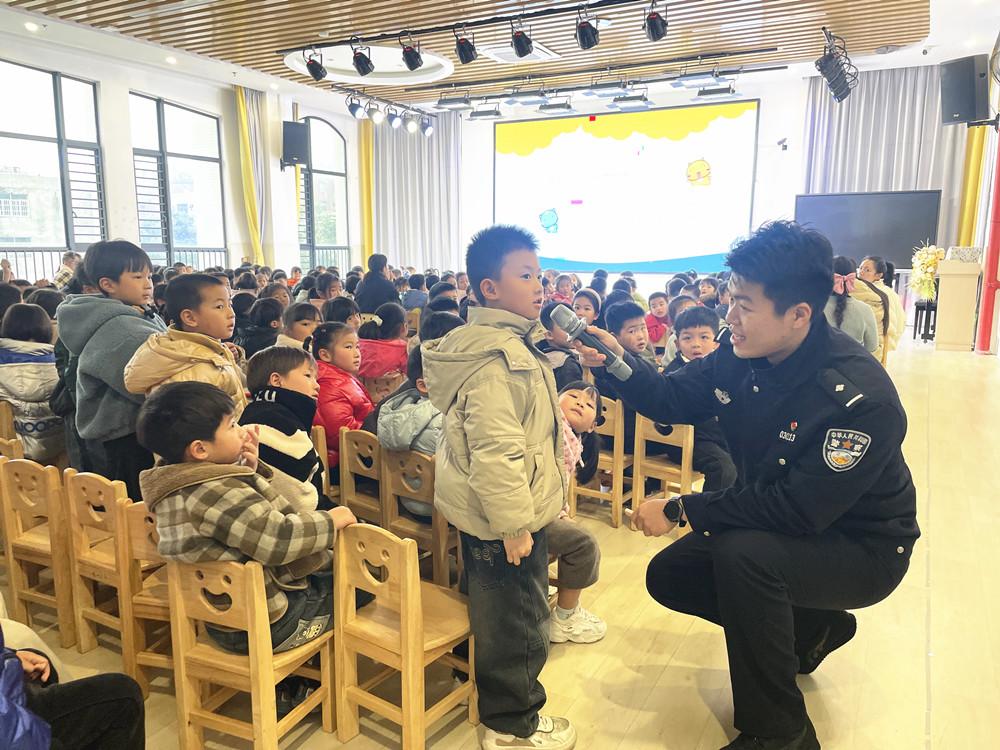 近日,平潭综合实验区公安局海坛支队民警走进辖区幼儿园开展“法治进校园”活动。图为民警与同学们互动。 |