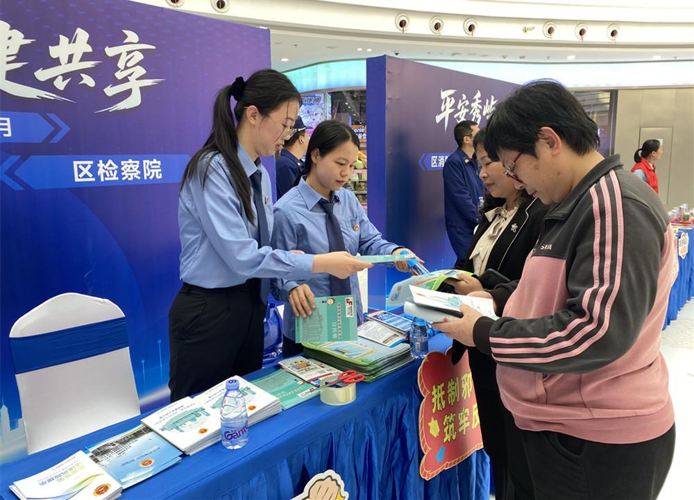 近日,莆田市秀屿区检察院干警到万达广场开展“平安秀屿 共建共享”主题普法宣传活动,现场为群众解答平安建设、法治等相关问题。图为检察干警向群众发放宣传材料。 |