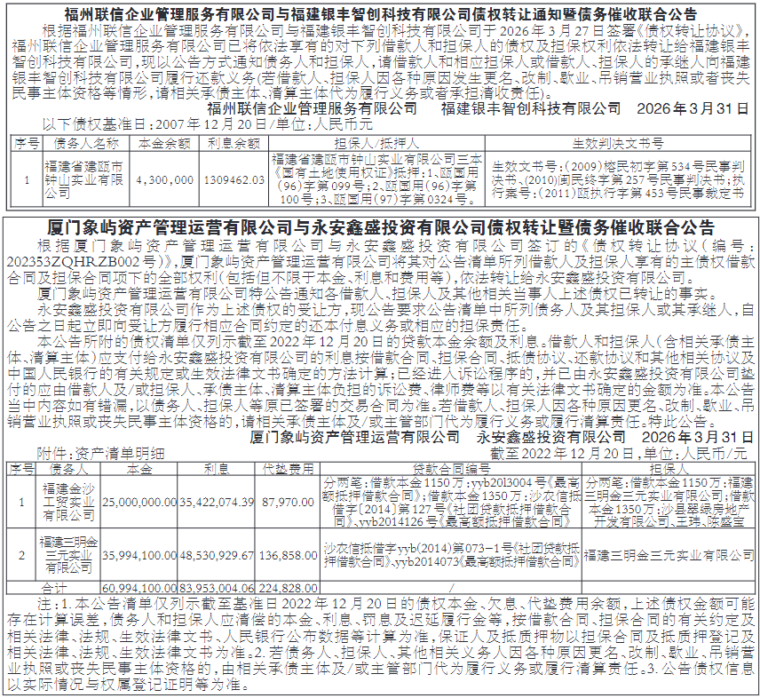 涉案保证金认领公告 福州市公安局马尾分局刑侦大队办理的以下两笔涉案保证金决定返还,经多次多方无法联系上当事人,现登报公告:陆慧芳,2025年1月6日被福州市公安局马尾分局采取取保候审强制措施,缴纳保证金1000元,2026年1月5日被福州市公安局马尾分局解除取保候审强制措施,需退还保证金1000元。林春锐,2025年1月6日被福州市公安局马尾分局采取取保候审强制措施,缴纳保证金1000元,2026年1月5日被福州市马尾区公安局解除取保候审强制措施,需退还保证金1000元。以上保证金自登报之日起六个月未认领的,将上交财政专户。联系人:陈警官,联系电话:0591-83687110。特此公告。 福州市公安局马尾分局刑侦大队 2026年3月31日 涉案物品认领公告 福州市公安局马尾分局刑侦大队办理的以下五十六件涉案物品决定发还,现因原主不明,现登报公告:2022年6月23日,我局在对福州市马尾区名城港湾21栋101单元进行搜查时,对房间内的手机、电脑、手机卡、记事本等五十六件物品予以扣押,现决定对上述物品予以发还。以上物品自登报之日起六个月未认领的,将依法上缴国库。联系人:陈警官,联系电话:0591-83687110。特此公告。 福州市公安局马尾分局刑侦大队 2026年3月31日 公告 2026年1月21日,三明市中级人民法院作出(2026)闽04破申9号民事裁定书,裁定受理明溪县农村信用合作联社对明溪县新夏松木业有限责任公司的破产清算申请。2026年1月22日,三明市中级人民法院作出(2026)闽04破申9号之一民事裁定书,裁定本案由福建省明溪县人民法院审理。本院立案后于2026年3月25日作出决定书,确定由福建远东大成(三明)律师事务所担任明溪县新夏松木业有限责任公司破产清算一案的管理人。明溪县新夏松木业有限责任公司的债权人应于2026年4月30日向管理人(通讯地址:三明市三元区福清商会大厦16层1601福建远东大成(三明)律师事务所;联系人:郑丽丽律师;联系电话:18359060024)申报债权。未在上述期限内申报债权的,可以在破产财产分配方案提交债权人会议讨论前补充申报,但对此前已进行分配无权要求补充分配,同时要承担为审查和确认补充申报债权所产生的费用。未申报债权的,不得依照《企业破产法》规定的程序行使权利。明溪县新夏松木业有限责任公司的债务人或财产持有人应尽快向管理人清偿债务或交付财产。此外,明溪县人民法院定于2026年5月13日上午9:00在明溪县人民法院第二法庭(如有变化另行通知)召开第一次债权人会议。 明溪县新夏松木业有限责任公司管理人 2026年3月31日 张掖市鑫美誉贸易有限公司与福州联信企业管理服务有限公司债权转让通知暨债务催收联合公告 2026年1月15日,张掖市鑫美誉贸易有限公司(曾用名为“福建省天裕盛丰资产管理有限公司”)与福州联信企业管理服务有限公司签订《债权转让协议》,将张掖市鑫美誉贸易有限公司对福建省建瓯市钟山实业有限公司【生效法律文书:(2009)榕民初字第534号民事判决书、(2010)闽民终字第257号民事判决书;执行案号:(2011)瓯执行字第453号民事裁定书的壹笔债权及与债权相关的全部权利转让给福州联信企业管理服务有限公司。现向上述债务人通知转让事由,且上述法律文书所确定的全部权利由债权受让人福州联信企业管理服务有限公司享有。 通知人:张掖市鑫美誉贸易有限公司、福州联信企业管理服务有限公司 2026年3月23日 拍卖公告 受委托,我司定于2026年04月08日下午15时在中拍平台公开拍卖以下标的:三元区交通运输局公路专用车辆及设备报废拍卖,起拍价:21402元,保证金:5000元。 有意竞买者,请按时缴纳竞买保证金并携带有效证件到我公司办理报名手续。 报名地址:三明市三元区崇桂新村92幢十层1.2号 看样地点:标的物所在地。 看样、报名截止时间:2026年04月08日12时止。 有关事项详询:13276057553(小罗) 福建鑫诚拍卖有限公司2026年3月31日 声明 吉林省满仓建筑工程有限公司(统一社会信用代码:91220802MA0Y5RN21D),经公司股东会/董事会决议,自本声明发布之日起,正式退出福建省行政区域内所有房屋建筑、市政、公路、水利等工程类及政府采购类招投标业务,不再参与福建省内任何招投标项目的报名、投标、开标等活动。本公司将妥善处理已参与项目的后续事宜,现在没有任何债权债务纠纷,将来产生任何债权债务纠纷跟公司也没有关系。特此声明。 吉林省满仓建筑工程有限公司 2026年3月31日 催收公告 大田县仙峰房地产置业有限公司、吴玉洲(身份证号:350500195702066515)、福建仙峰华捷温泉酒店有限公司: 根据DF20130712001号《抵押借款合同》,大田县仙峰房地产置业有限公司向我司借款1000万元,由福建仙峰华捷温泉酒店有限公司以土地使用权提供抵押担保;根据DF20130917003号《抵押借款合同》,吴玉洲向我司借款500万元,由福建仙峰华捷温泉酒店有限公司以土地使用权提供抵押担保,并由大田县仙峰房地产置业有限公司提供连带责任保证。借款人与担保人均未偿还以上债务。我司多次以EMS快递向大田县仙峰房地产置业有限公司、福建仙峰华捷温泉酒店有限公司的注册经营地址以及吴玉洲的户籍住所地寄送催收通知,但吴玉洲拒收,大田县仙峰房地产置业有限公司和福建仙峰华捷温泉酒店有限公司则均因收件人不在收件地址,且无法联系收件人、电话无法接通的原因被退回。为此,现特公告催收上述债权,要求借款人