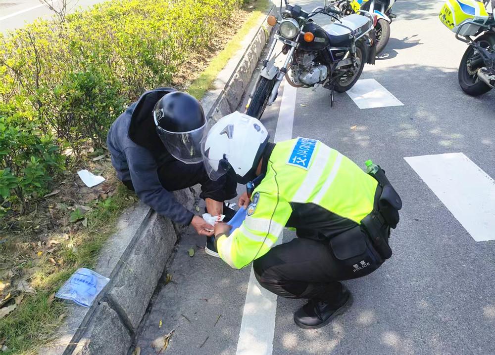 4月5日11时许,惠安县公安局交通管理大队铁骑队员在惠安大道巡逻时,发现一名男子坐在路边,小腿处有明显伤口且流血不止。见此情况,铁骑队员立即对男子的伤口进行消毒处理,并送往医院救治。 |