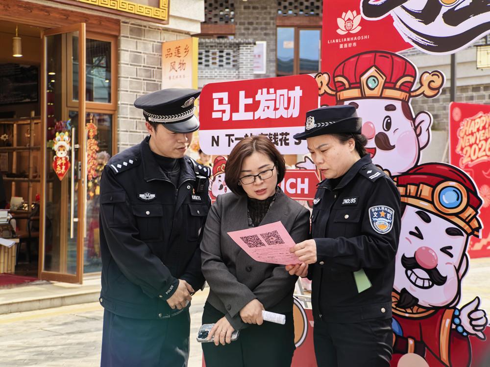 近日,建宁县公安局城关派出所民警辅警深入绥安里特色商业街、永宁门开展反诈宣传,引导群众安装“国家反诈中心”App。图为民警辅警向群众发放宣传单,并释法答疑。 |