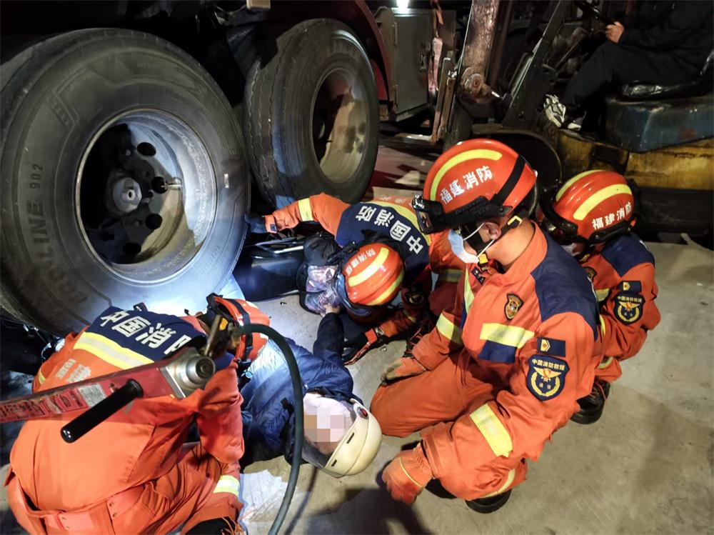 消防救援人员到达现场后发现,半挂车的中桥轮胎已压住摩托车车身,驾驶员被紧紧卡在下方狭小空间内,因被困多时,情绪紧张。由于驾驶员被卡部位情况不明,且货车底部作业空间狭窄,若强行施救极易造成被困人员二次伤害,救援存在一定难度。 消防救援人员现场制定方案:一组人员利用千斤顶对车身进行稳固顶撑,逐步扩大救援空间;另一组人员一边安抚被困驾驶员,一边使用撬棍对卡压部位进行谨慎扩张。 经过约35分钟的紧张施救,被困驾驶员被成功解救出来,并交由现场医护人员送往医院救治。 |