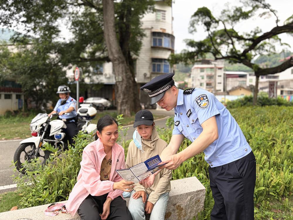 近日,安溪县公安局福田派出所组织民警向福田乡群众及游客发放反诈宣传册,细致讲解反诈知识,教授防范诈骗技巧。图为民警结合典型案例向群众揭示诈骗套路。 |