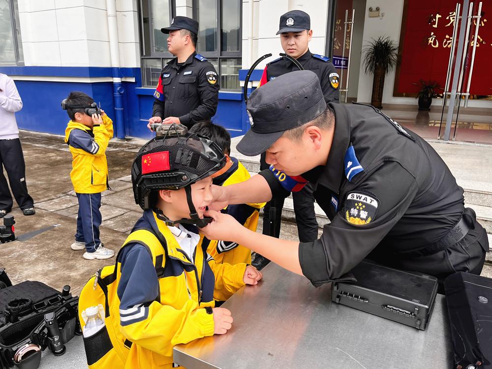 4月24日,福鼎市公安局白琳派出所邀请白琳中心幼儿园的师生走进警营,开启一场“零距离”的警营探秘之旅。活动中,该所联合巡特警反恐大队开展警用装备参观活动,邀请学生近距离观摩体验警用装备,并答疑解惑。图为民警为学生试戴警用装备。 |